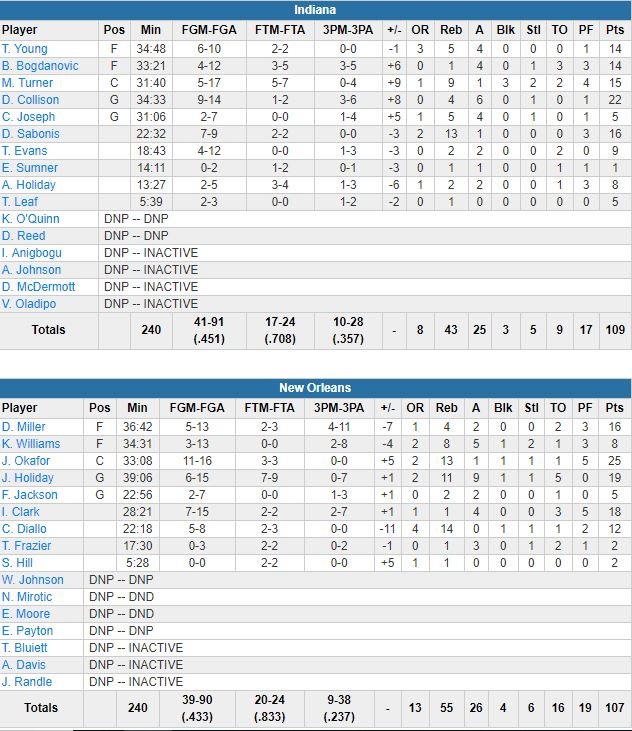 Darren Collison, 22 points à 9/14, 4 rebonds et 6 passes, a bouclé son match avec un enchaînement 3-points, shoot à 6 mètres à la fin des 24 secondes et un lancer-franc clutch dans les 2 dernières minutes pour permettre à Indiana (2ème victoire d’affilée) de l’emporter à New Orleans. Son coéquipier Domantas Sabonis a ajouté 16 points et 13 rebonds, Myles Turner 15 points et 9 rebonds. New Orleans avait le ballon en main, l’équipe menée 109-106 après une faute offensive sifflée à Aaron Holiday, et Cory Joseph a commis une faute sur Jrue Holiday (19 points à 6/15, 11 rebonds, 9 passes). Ce dernier a rentré le premier avant de rater intentionnellement le 2ème, mais les Pelicans n’ont pas réussi à capter le rebond dont ils avaient besoin pour tenter d’égaliser.