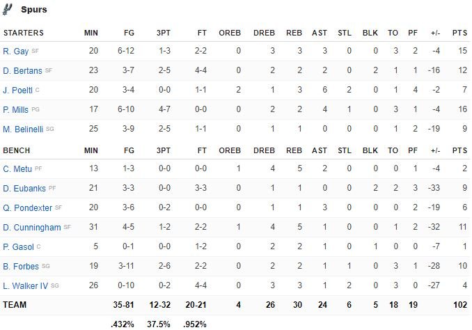 Dans ce matchup de deux des équipes les plus adroites à 3-points en NBA, Golden State a terminé à 16/34 de loin, les Spurs 12/32. San Antonio, mené par les 16 points à 4/7 à 3-points de Patty Mills et 4 autres joueurs à au moins 10 points, ont démarré leur match sur un 10/15 aux tirs (4/7 à 3-points) avant de rater leurs 7 tirs suivants.