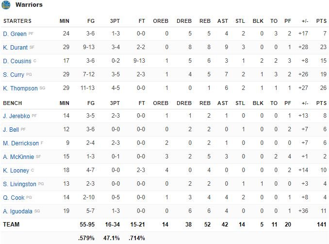 Les Warriors (50 à 8 sur les points inscrits en contre-attaque sur ce match !), qui avaient perdu à San Antonio le 18 novembre dernier, sont invaincus cette saison (6-0) avec le cinq Curry, Thompson, Durant, Green, Cousins.