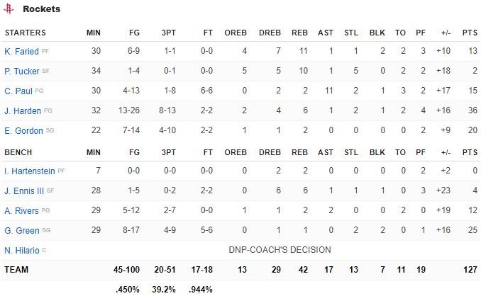 Avant ce match Sacramento (mené de jusqu’à 37 points en seconde mi-temps) restait sur 3 victoires d’affilée et 4 en 5 matchs. Buddy Hield a signé 20 points à 8/17 et 10 rebonds, Marvin Bagley III 10 points à 4/12 et 10 rebonds. Même éloigné de la ligne des lancers-francs (2/2), le MVP en titre a planté 4 tirs à 3-points durant un 19-3 dans les 5 dernières minutes du 2ème quart pour permettre aux siens de mener 76-45 à la pause. Chris Paul a fini à 15 points à 4/13 et 11 passes. Houston a shooté à 20/51 à 3-points contre 11/3 pour les Kings.