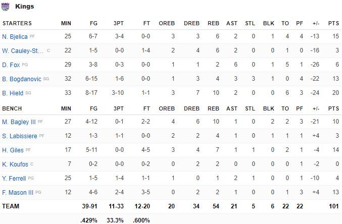 Avant ce match Sacramento (mené de jusqu’à 37 points en seconde mi-temps) restait sur 3 victoires d’affilée et 4 en 5 matchs. Buddy Hield a signé 20 points à 8/17 et 10 rebonds, Marvin Bagley III 10 points à 4/12 et 10 rebonds. Même éloigné de la ligne des lancers-francs (2/2), le MVP en titre a planté 4 tirs à 3-points durant un 19-3 dans les 5 dernières minutes du 2ème quart pour permettre aux siens de mener 76-45 à la pause. Chris Paul a fini à 15 points à 4/13 et 11 passes. Houston a shooté à 20/51 à 3-points contre 11/3 pour les Kings.