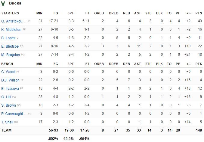 Les Bucks, qui ont battu leur record de points en saison avec leurs 148 points marqués, étaient déjà à 50 (à 2 points du record de franchise établi en 1979) après seulement 12 minutes de jeu (20/27 aux tirs), et ils menaient 85-65 à la pause !