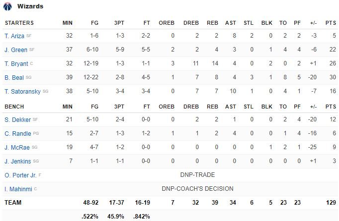 Menés par les 30 points (12/22, 8 rebonds, 4 passes) de Bradley Beal, les 26 points de Thomas Bryant (12/19, 14 rebonds, 4 passes) et les 22 points (6/10, 4 rebonds) de Jeff Green, les Wizards ont recollé à 120-113 sur un layup de Chasson Randle à 10’22 de la fin. Bledsoe a mis fin au suspense avec 10 points dont un dunk après un lancer raté d’Antetokounmpo et un 3-points à 7’07 pour reprendre 20 points d’avance, 138-118.