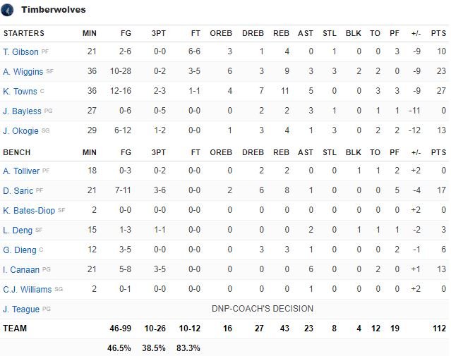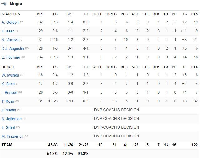 Les Wolves (5ème défaite en 6 matchs) étaient devant 39-38 en début de 2ème quart mais ce dernier a vite basculé en faveur des Floridiens, vainqueurs 39-27 de la période. Ross a fini à 20 points sur la première mi-temps, durant laquelle le Magic a rentré 65% de ses tentatives. Andrew Wiggins a marqué 10 de ses 23 points (10/28, 9 rebonds, 3 passes) dans le 3ème quart, mais Minnesota n’a pas réussi à revenir à moins de 11 points jusqu’à un 2+1 de Karl-Anthony Towns (27 points à 12/16, 11 rebonds, 5 passes) à 2’39 de la fin du match. Wiggins a intercepté un ballon au milieu du terrain et aurait pu ramener le déficit à 7 points si Ross n’était pas venu le contrer en mode chase-down clutch.