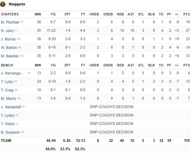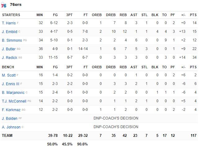 Harris pour son premier match a terminé à 14 points à 6/12, 8 rebonds, 3 passes, Ben Simmons 12 points à 5/10, 4 rebonds, 6 passes. Philadelphie a pris le meilleur départ en remportant le premier quart 33-23 (dont un 10-0 dès l’entame avec un Harris très impliqué dans le jeu). Elle menait 50-34 avant d’encaisser un 22-6 qui a permis à Denver d’égaliser à 56 partout à la mi-temps. Les deux équipes ont fait jeu égal au retour des vestiaires même si les Sixers menaient 83-82 après trois quarts-temps. Harris a rentré un tir pour le +2, 105-103 avec moins de 4 minutes à jouer au compteur puis a capté un rebond qui a mené à un layup d’Embiid. Butler a ensuite volé un ballon, obtenu la faute et rentré 2 lancers-francs, 109-103. Finalement un dunk de Simmons sur Mason Plumlee (Allen Iverson a sauté de son siège) a eu raison des espoirs de la 2ème équipe de l’Ouest.