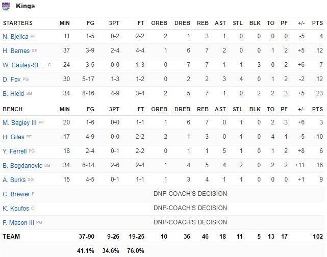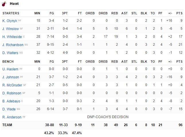 Encore menés 96-93 à 2’05 de la fin, les Kings (menés 59-50 à la mi-temps) ont bouclé leur match sur un 9-0 (dont un dunk de Willie Cauley-Stein et 4 lancers réussis par Bogdanovic et Hield), dans les 2 dernières minutes. Dwyane Wade (15 points à 6/14, 4 rebonds, 4 passes), touché à la tête en fin de 1er quart-temps puis revenu en jeu à 4’35 de la mi-temps, a perdu un précieux ballon sur une tentative de alley oop pour Hassan Whiteside (17 points à 7/14 et 19 rebonds) puis a raté un 3-points à 32 secondes de la fin. Josh Richardson (21 points à 9/15, 4 passes) a aussi raté un layup et perdu un ballon dans les dernières secondes. Miami a encaissé un 27-13 dans le dernier quart.