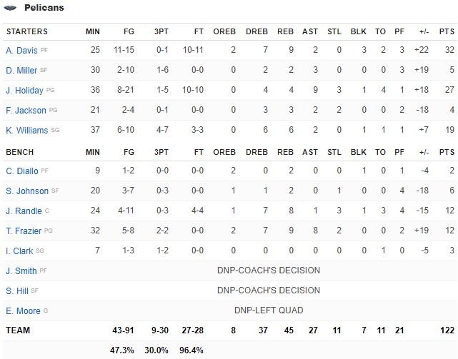 Jrue Holiday a ajouté 27 points à 8/21, 4 rebonds et 9 passes et Kenrich Williams 19 points à 6/10 et 6 rebonds ont mené l’attaque dans le dernier quart, Davis (sifflé quand il avait le ballon et applaudi quand il marquait) étant resté sur le banc toute la période malgré le fait que le match était encore serré (temps de jeu limité à 25 minutes). Alvin Gentry a fait jouer Julius Randle (12 points à 4/11, 8 rebonds, 3 interceptions) à sa place. L’ancien Laker a rentré quelques paniers intérieurs et des lancers importants dans les dernières minutes.