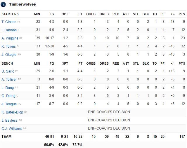 Karl-Anthony Towns a signé 32 points à 12/20 et 8 rebonds pour Minnesota. Il a ramené les Wolves à 2 points 114-112 dans la dernière minute sur un dunk mais Randle lui a répondu dans la raquette puis s’est emparé du rebond après un jump hook raté de Towns à 16 secondes de la fin. Andrew Wiggins a signé 23 points (10/17, 10 rebonds, 7 passes) pour les Wolves, qui ont dominé le rebond 49-45 mais qui ont été dominés 27-16 aux points inscrits sur lancers-francs. Jahlil Okafor n’a pas joué (cheville), Jeff Teague (pied) était de retour après 8 matchs d’absence pour Minnesota mais n’a joué que 17 minutes (12 points à 6/7, 5 passes).