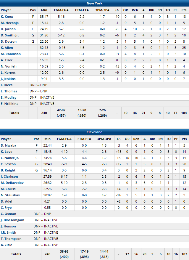 Dans le duel des cancres à Cleveland, les Cavaliers l’ont emporté de 3 petits points, portés par les 20 points (7/21, 3 passes) de Collin Sexton, qui a rentré 2 lancers-francs clutchs à 17 secondes de la fin pour donner 3 points d’avance aux siens. Pour New York, ce nouveau revers est tout simplement synonyme de pire série de l’histoire de la franchise, avec 17. Les Knicks, menés par les 25 points (10/16, 6 passes) de Kadeem Allen(record en carrière) ont pourtant réussi à effacer un retard monté jusqu’à 17 points mais ont manqué leurs occasions (dont un 3-points manqué par Luke Kornet à 21 secondes du buzzer) de passer devant ou d’égaliser dans la dernière minute. Larry Nance Jr. a compilé 15 points et 16 rebonds dans cette 1ère victoire en 5 matchs pour Cleveland. L’équipe a gagné pour la 1ère fois de la saison avec Kevin Love (14 points à 4/10 et 9 rebonds en 16 minutes) sur le parquet.