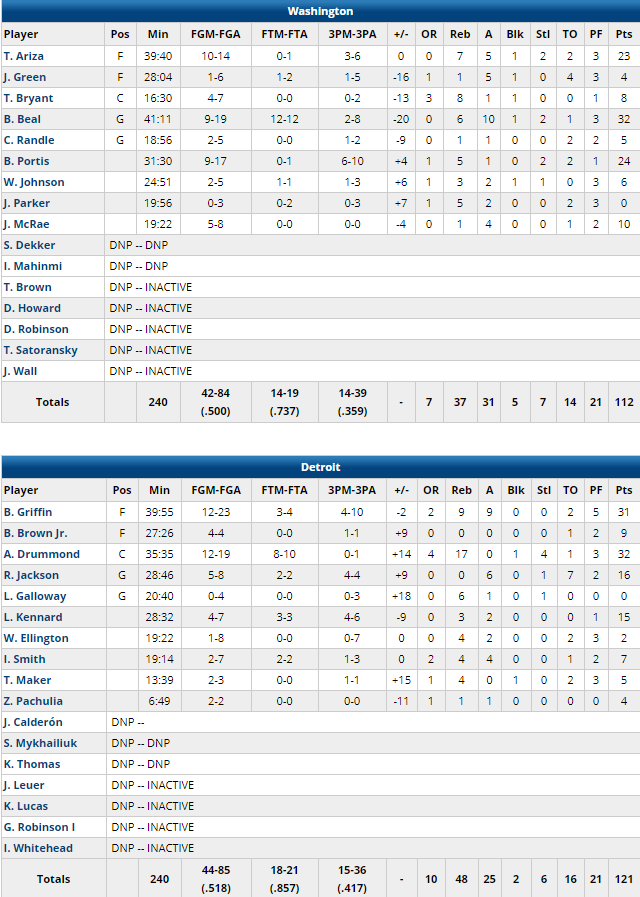 Detroit, qui est passé 8ème avant-hier, confirme sa place dans les playoffables avec un succès face à un concurrent direct : les Wizards. Ils l’emportent 121-112 et comptent désormais 1 match d’avance sur Miami, 9ème. Blake Griffin (31 points à 12/23, 9 rebonds et 9 passes) et Andre Drummond (32 points à 12/19, 17 rebonds et 4 interceptions) ont régné dans la raquette, bien aidé aussi par les 16 points et 6 passes de Reggie Jackson et les 15 points de Luke Kennard. Les Pistons shootent à 51.8% dont un superbe 15/36 à 3-pts, une adresse légèrement supérieure à celle de Washington, qui a aussi laissé 10 rebonds offensifs aux locaux. Le trio Bradley Beal (32 points à 9/19 et 10 passes), Bobby Portis (24 points à 9/17 dont 6/10 à 3-pts) et Trevor Ariza (23 points à 10/14, 7 rebonds) n’a pas suffi. Detroit a maîtrisé la seconde mi-temps en s’envolant sur un 16-4 dans le 3ème acte.
