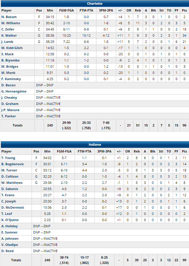 Indiana est intenable dernièrement et s’accroche à sa 3ème place à l’Est avec une 6ème victoire de suite, acquise face aux Hornets 99-90. Ils ont fait parler leur collectif avec 5 joueurs à au moins 10 points et limité les Hornets à 32.2% malgré les 34 points de Kemba Walker. Indiana a remporté le premier quart 32-19 et limité Charlotte à 38 points à la pause et a ensuite tenu tant bien que mal. Charlotte est revenu à 1 point en 3ème acte mais n’a jamais pu revenir à hauteur puisque les locaux ont répondu par un 11-0.