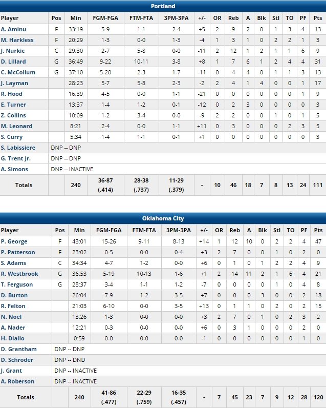 Le Thunder a joué sans Jerami Grant (cheville) et Dennis Schröder (personnel). George a marqué 17 points dans le 1er quart, dominé 36-26 par OKC (16/35 à 3-points, 23-10 sur contre-attaque). Portland a été limité à 33.3% en 1ère mi-temps, C.J. McCollum à 4/15 et Lillard 1/10. Westbrook a délivré 6 de ses passes décisives dans le dernier quart.