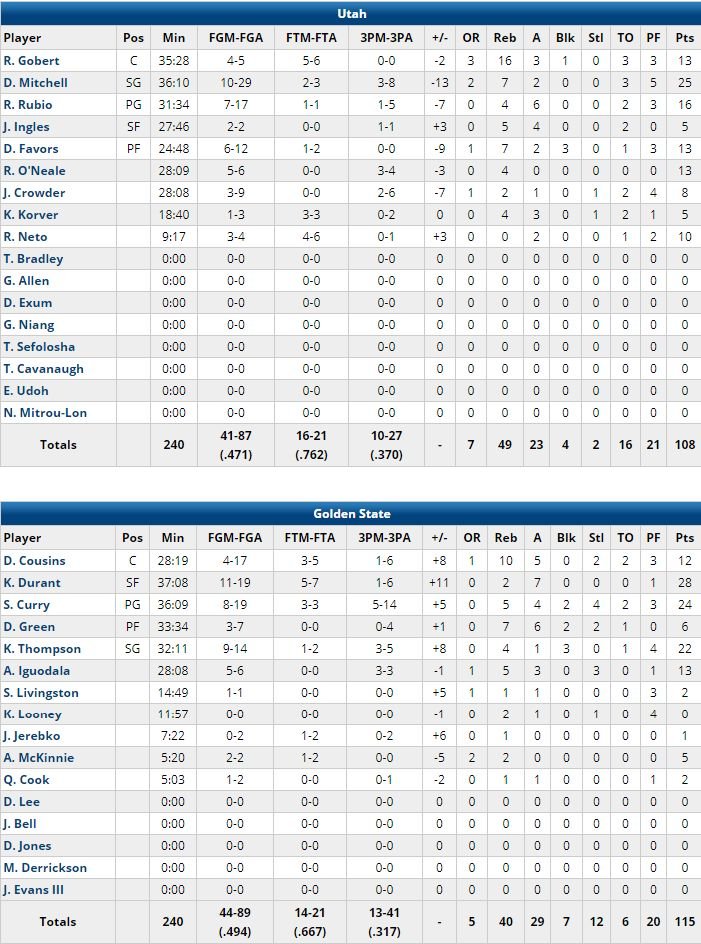 Utah en tête de la fin du 3ème quart et jusqu’au début du 4ème (jusqu’à 7 points d’avance, 91-84 Jazz à 9’51 de la fin après 2 lancers de Raul Neto) grâce à un 40-34 passé aux champions au retour des vestiaires alors que les deux équipes s’étaient quittées sur le score serré de 47-44 en faveur des Warriors (dominés 30-22 dans le 2ème quart mais vainqueurs 25-14 du 1er) à la pause, Stephen Curry (28 points à 8/19, 5/14 à 3-points, 5 rebonds, 4 passes, 2 contres et 4 interceptions) et ses coéquipiers ont signé l’arrêt de mort du Jazz (dominé 28-16 aux points sur contre-attaque) sur un 21-4 dans le dernier quart.