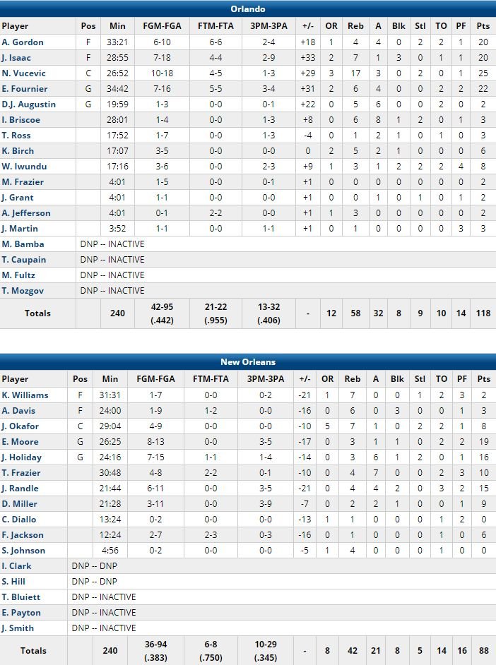 Anthony Davis (3 points à 1/9 en 24 minutes) n’a plus envie de jouer pour les Pelicans, et apparemment c’était également le cas de ses coéquipiers cette nuit face au Magic. New Orleans s’est pris une énorme fessée par Nikola Vucevic (25 points à 10/18, 17 rebonds, 3 passes), Evan Fournier (22 points à 7/16, 6 rebonds, 4 passes), Aaron Gordon (20 points à 6/10, 4 rebonds, 4 passes) et Jonathan Isaac (20 points à 7/18, 7 rebonds, 3 contres), vainqueurs 118-88 au Smoothie King Center.