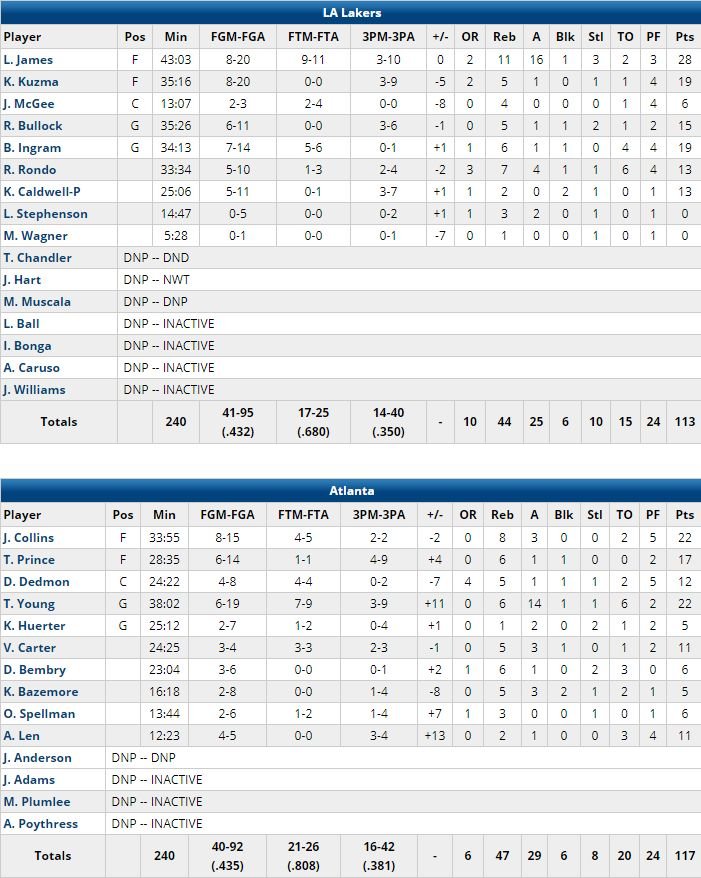 L.A. est revenu à 116-113 après un ballon perdu de leurs adversaires et un layup de James mais après avoir désespérément chercher à intercepter, l’équipe a été obligée de faire faute sur Kevin Huerter à 4.3 secondes de la fin. Il a rentré son 2ème lancer-franc et tué le match. John Collins a terminé à 22 points à 8/15, 8 rebonds et 3 passes pour les Hawks. Les deux équipes ont galéré dans les 12 dernières minutes en attaque avec un 5/19 aux tirs pour Atlanta et un 6/22 pour Los Angeles. Même en ne marquant que 7 points sur les dernières 6’33 du match, les Hawks ont tenu. Taurean Prince a rentré un 3-points important à 1’48 de la fin et Young a trouvé un layup plus la faute après avoir débordé James pour empêcher le comeback californien.