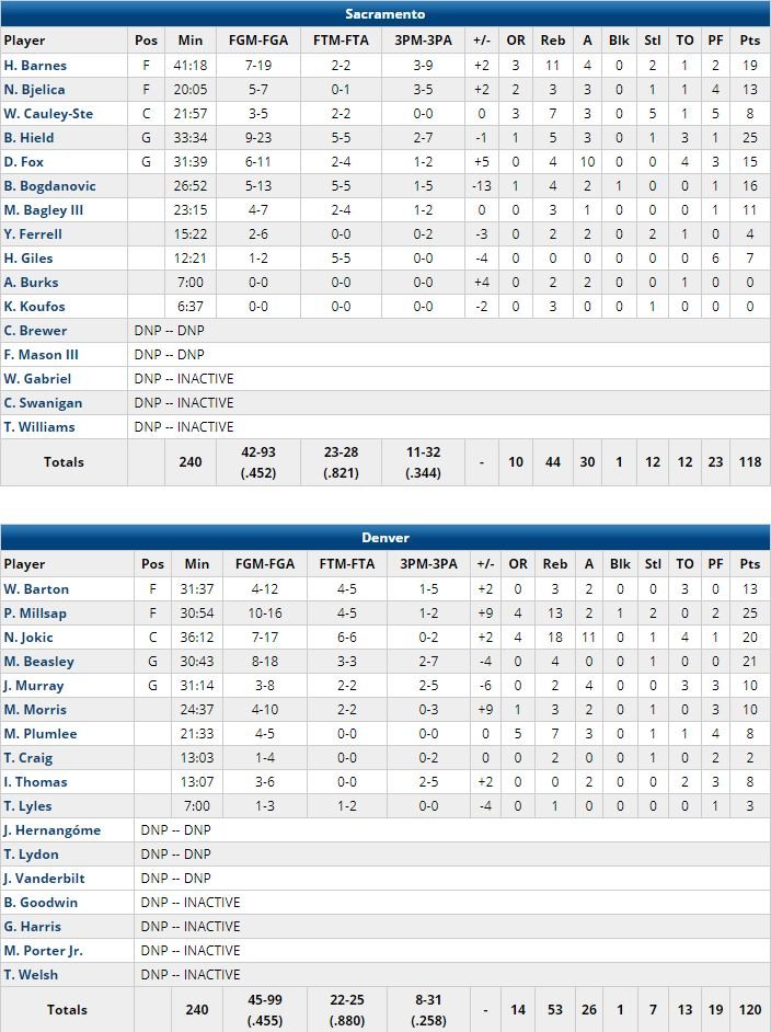 Michael Malone le coach des Nuggets a été éjecté à 1’33 de la mi-temps pour avoir contesté un coup de sifflet. Harrison Barnes a terminé à 19 points et 11 rebonds pour les Kings, De’Aaron Fox 15 points et 10 passes Malik Beasley a signé 21 points à 8/18 et 4 rebonds pour Denver alors que Jamal Murray a été limité à 10 points à 3/8.