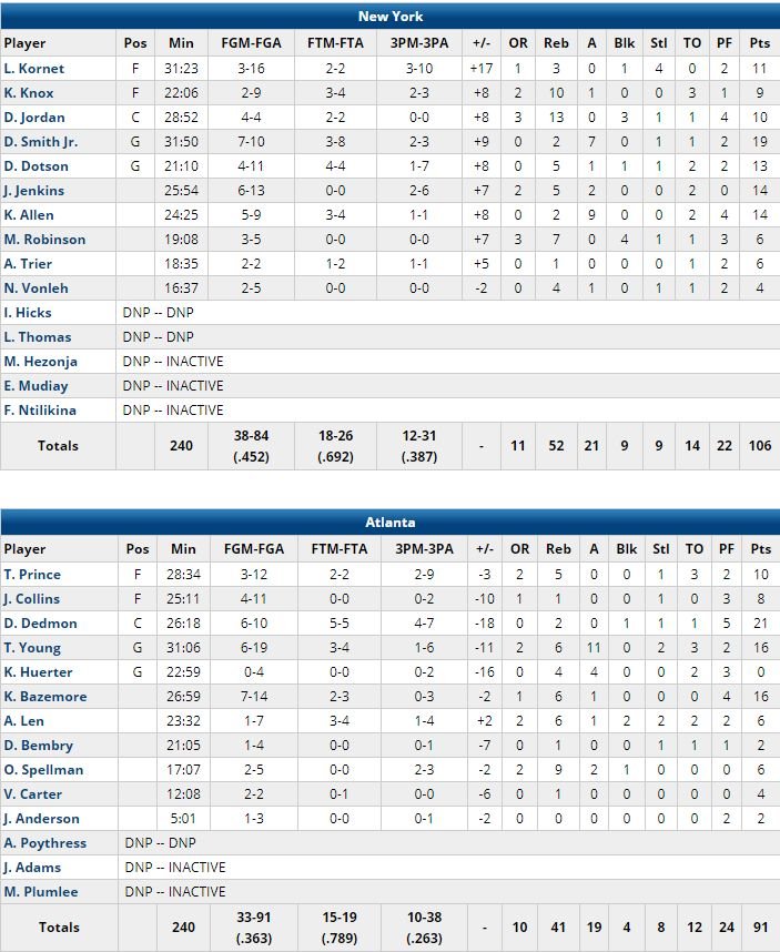 L’équipe, également aidée par les 14 points chacun de Kadeem Allen et John Jenkins ou encore les 10 points à 4/4, 13 rebonds et 3 contres de DeAndre Jordan, n’a jamais été mené dans ce match, qui n’a enregistré que 2 égalités, dans le 2ème quart-temps. New York a passé un 14-0 à ses adversaires et menait 28-13 à la fin du 1er quart. Atlanta a raté ses 11 premiers tirs. Sortis d’un succès sur les Lakers la veille, les Hawks (revenus à 54-51 à la pause grâce à un 38-26 dans le 2ème) n’ont plus réussi à passer sous la barre des 10 points de retard après un hook shot de John Collins qui les avait ramenés à 87-78 à 9’39 de la fin.