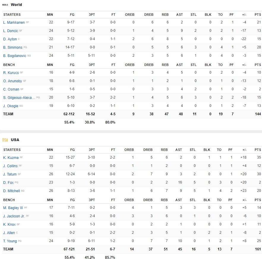 Dunks, layups, 3-points ont comme d’habitude alimenté ce match orienté fun, composé de 20 joueurs rookies ou sophomores. Les deux équipes (toutes les deux à 55% aux tirs) ont combiné pour 37 tirs à 3-points réussis (21/51 pour la Team USA et 16/52 pour la Team World) et 55 dunks. Ben Simmons a terminé meilleur marqueur de la Team World avec 28 points à 14/17, 5 rebonds et 6 passes devant Lauri Markkanen (21 points à 9/17) . Luka Doncic a signé 13 points à 5/12, 5 rebonds et 9 passes.
