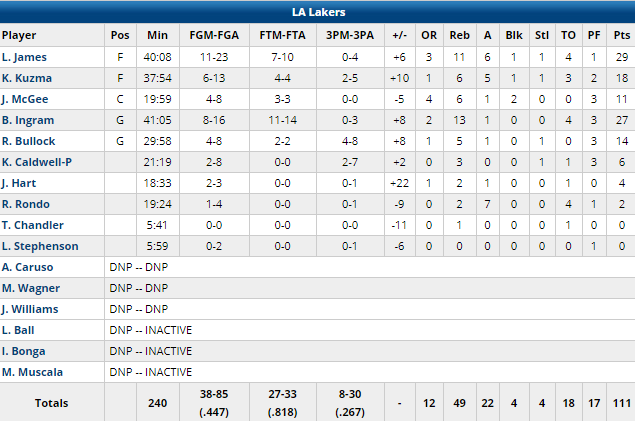 L.A. a couru après le score quasiment tout le match et était encore mené 95-88 à 7’49 de la fin lorsque l’équipe a réussi un 17-4 en 6 minutes. James a marqué 8 points durant ce run et a donné l’avantage aux siens, qui ont pris jusqu’à 8 points d’avance dans la dernière minute, 99-97 à 4’15. C’est la 6ème fois cette saison que les Lakers gagnent après avoir pris 15 points de retard ou plus.