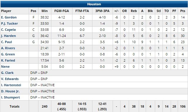 Chris Paul a terminé à 23 points avant de sortir pour 6 fautes, Clint Capela 12 points à 6/9 et 11 rebonds pour son retour. L.A. a dominé le rebond 49-38.
