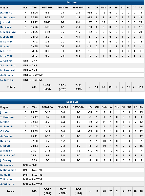 Les Blazers s’imposent à Brooklyn dans un match qui était piège mais qu’ils ont bien maitrisé, résistant notamment au retour des locaux en fin de rencontre. Ils se sont appuyés sur leurs deux intérieurs Jusuf Nurkic (27 points à 10/15, 12 rebonds et 3 contres en 28 minutes) et Enes Kanter (18 points à 8/9 et 9 rebonds en 20 minutes). CJ McCollum ajoute 21 points à 9/19alors que Damian Lillard a arrosé avec 13 points à 5/21. Brooklyn a été très maladroit et l’a payé avec seulement 39.8% aux tirs à l’image du 4/16 de D’Angelo Russell, du 2/11 de Shabazz Napier ou encore le 4/11 de Caris LeVert. Difficile dans ces conditions de s’imposer malgré 17 points d’Allen Crabbe et 15 d‘Ed Davis en sortie de banc.