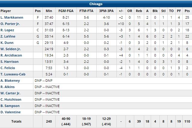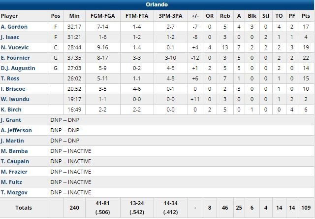 Orlando (qui restait sur 5 victoires) a raté 11 de ses 24 lancers-francs, dont 2 par D.J. Augustin (pourtant à 87.3% en carrière) à 34 secondes de la fin. Nikola Vucevic (19 points, 13 rebonds) sur le banc dans la dernière minute après un temps-mort, Robin Lopez a tranquillement pris le rebond offensif et marqué 2 points pour donner l’avantage 108-106 aux siens. Steve Clifford a expliqué après le match qu’il n’avait pas vu que Chicago avait fait entrer Lopez.