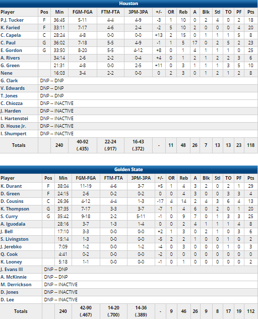 Eric Gordon a terminé meilleur marqueur pour Houston avec 25 points à 8/20, Kenneth Faried a terminé à 20 points à 7/17 et 10 rebonds et P.J. Tucker 18 points à 5/11 et 10 rebonds (Clint Capela a aussi pris au moins 10 rebonds avec 15 prises). Juste avant les lancers-francs clutchs de Paul, Stephen Curry (25 points à 9/18, 9 rebonds, 7 passes) avait ramené les Warriors (menés de jusqu’à 20 points et devant au mieux de seulement 2) à 114-108 à 1’57 de la fin puis il avait rapproché les siens à 4 points à 1’26 sur 2 lancers. Kevin Durant a signé 29 points à 11/19, 4 rebonds, 3 passes et 2 contres, DeMarcus Cousins 13 points et 14 rebonds et Klay Thompson 20 points et 6 passes.