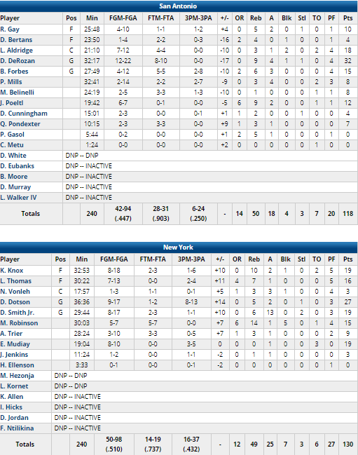 Les Knicks ont profité d’une défense texane catastrophique pour briller en attaque avec notamment 27 points à 9/17 de Damyean Dotson, 19 points à 8/17, 6 rebonds et 13 passes de Dennis Smith Jr., 19 points à 8/18 et 10 rebonds de Kevin Knox, ou encore un excellent Mitchell Robinson, qui compile 15 points, 14 rebonds et 5 contres en sortie de banc, sans oublier un excellent Emmanuel Mudiay et ses 19 points à 8/10. NY shoote à 51% dont un superbe 16/37 à 3-pts et perd seulement 6 ballons. E face les Spurs ont pris l’eau en défense et ont compté jusqu’à 26 points de retard et leur tentative de retour en fin de rencontre a échoué, la faute à une défense trop permissive. DeMar DeRozan signe 32 points à 12/22 et 9 rebonds alors que LaMarcus Aldridge ajoute 18 points à 7/12. Hormis le 6/7 de Jakob Poetl, le reste de l’équipe arrose avec un 6/24 derrière l’arc.
