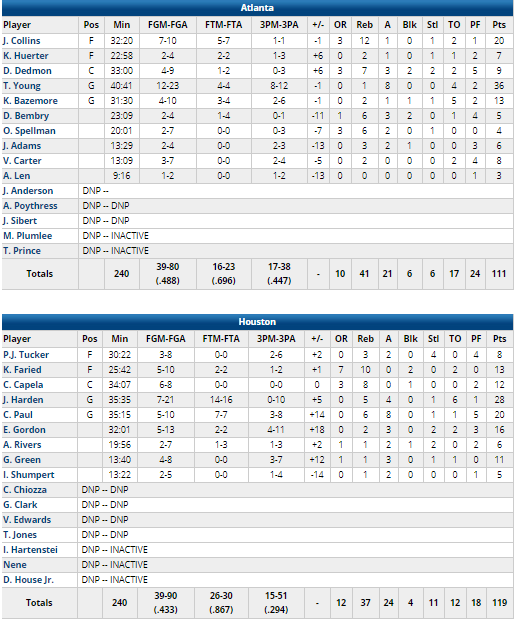 Le barbu a été très bien épaulé par Chris Paul, qui ajoute 20 points, 6 rebonds et 8 passes alors qu’Eric Gordon score 16 points, Kenneth Faried 13 et Clint Capela 12. Houston shoote ç seulement 43.3% alors qu’Altanta termine à 48.8% mais rentre 15 3-pts, 25 lancers et prend 12 rebonds offensifs. En face Atlanta s’est appuyé sur un énorme Trae Young, auteur de 36 points à 12/23 dont 8/12 à 3-pts et 8 passes alors que John Collins compile 20 points et 12 rebonds.