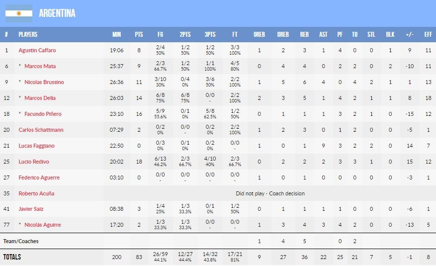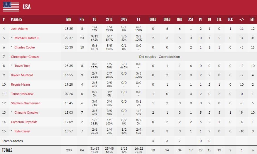 Michael Frazier II a terminé meilleur marqueur de l’équipe – qualifiée depuis longtemps – avec 23 points. L’Argentine (18 points de Lucio Redivo) a mené de jusqu’à 9 points dans le dernier quart et encore de 6 à 1’20 de la fin du match avant d’encaisser un run fatal.