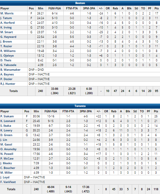 Pourtant ça n’avait pas mal commencé pour Boston dans un premier quart en forme de chassé-croisé où l’équipe de Brad Stevens a terminé en tête 32-30. Mais ces derniers se sont écroulés dans le second en encaissant un terrible run : un 18-0 ! Boston n’a pas réussi à arrêter l’avalanche et Toronto s’est retrouvé en tête 48-34 et a enfoncé le clou en se baladant totalement pour mener 66-43 et finalement 66-45 à la mi-temps. On a attendait un réveil des verts mais il n’est jamais arrivé et les Canadiens ont pris jusqu’à 31 points d’avance…
