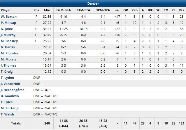 Mené de 13 points (64-51) à la pause (deux 3-points de Jokic dans les dernières 56 secondes du 2ème), OKC a marqué les 8 premiers points du 3ème quart mais cela n’a pas empêché Denver de prendre ensuite sa plus large avance de la rencontre (+18) derrière avant un 3-points de George du milieu de terrain pour ramener OKC à 91-78 avant le 4ème. Le Thunder est revenu par sa défense en forçant 5 turnovers sur 6 possessions de Denver pour égaliser à 97 partout sur un 3-points de Dennis Schröder à 6’02. Westbrook a suivi avec un tir longue distance et l’équipe est passée devant pour la première fois depuis le début du match. Murray a répondu à son vis-à-vis de loin puis le match est resté serré jusqu’à la fin. Murray a rentré un autre 3-points, suivi d’un layup de Jokic après un autre signé Westbrook (112-106 Denver à 1’36) puis l’intérieur a assuré la victoire en rentrant 5 lancers sur 6 (117-108 à 44 secondes de la fin).