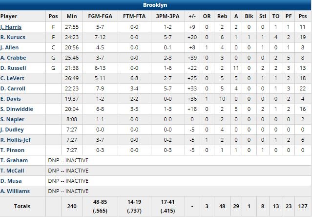 Les Nets avaient besoin d’une victoire et ils n’ont pas fait les choses à moitié cette nuit pour la réception de Dallas ! L’équipe s’est tout simplement imposée de la plus grande marge de son histoire (depuis le déménagement de la franchise de New Jersey à Brooklyn en 2012) à domicile (+39), 127-88. DeMarre Carroll a terminé meilleur marqueur avec 22 points devant Rodions Kurucs (19 points), Caris LeVert (18 points) et Spencer Dinwiddie (16 points). D’Angelo Russell a signé 13 points et 11 passes.