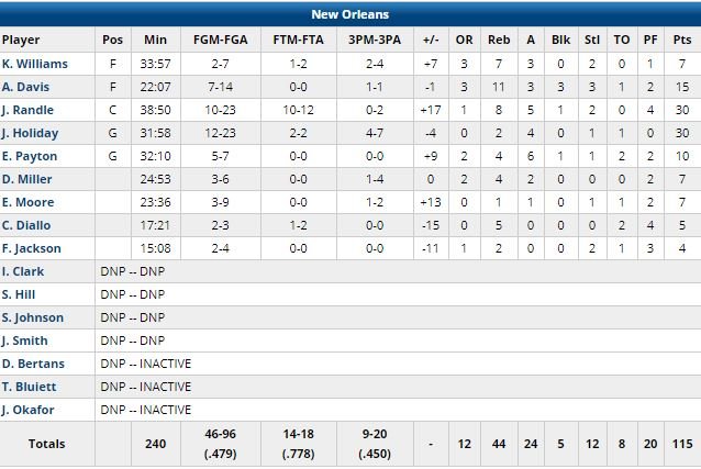 Utah a rentré 10 de ses 15 premiers tirs tentés dans le 1er quart et a pris le contrôle 12-2 mais Holiday a maintenu les siens avec 10 points dans la période dont deux 3-points consécutifs pour revenir à 17-15. Le Jazz en a remis une couche dans le 2ème avec un 16-5 boulé par un 3-points de Ricky Rubio, 58-41. Nouveau comeback de New Orleans dans le 3ème : l’équipe a scoré sur 7 possessions d’affilée et est revenue à 78-77 sur un dunk de Randle. Davis a manqué le layup pour passer devant et Crowder et Korver ont calmé le jeu de loin. Il a ensuite fallu attendre la fin du 4ème pour revoir les Pelicans revenir via un 22-2 conclu par deux paniers de Randle. L’équipe a marqué pendant 6 possessions consécutives et pris les devants 111-105.