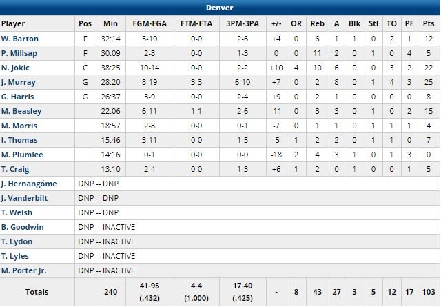 Jamal Murray (25 points) a manqué un 3-points à 16.2 secondes du buzzer puis un runner 5 secondes plus tard mais les Nuggets ont conservé la possession, le ballon ayant été envoyé en sortie par les locaux. Aldridge a ensuite dévié la passe de Nikola Jokic (22 points, 10 rebonds) et Rudy Gay a obtenu la faute derrière. Il a raté ses 2 lancers à 4 secondes de la fin. Gary Harris (8 points à 3/9) a raté sa tentative à 3-points sur Patty Mills dans le corner gauche, game over. C’est la 13ème fois d’affilée que Denver (3ème défaite d’affilée) perd à San Antonio.