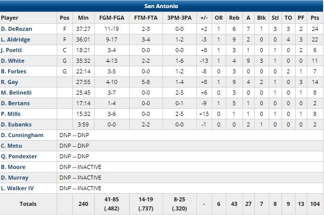 Les Spurs avaient marqué les 7 premiers points du match puis mené 36-17 avant de voir revenir leurs adversaires à 3 points en milieu de 3ème quart-temps (ils ont été limités à 4/10 sur les 6 premières minutes de la seconde mi-temps).