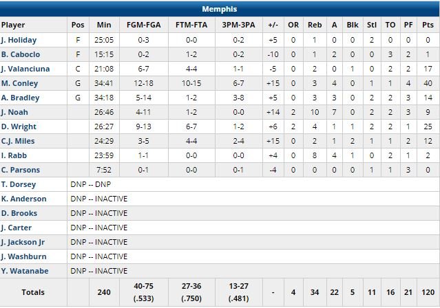 Mike Conley n’a laissé aucune chance aux Blazers dans le money time. Auteur de 19 de ses 40 points (12/18, 3 rebonds, 4 passes), le meneur des Grizzlies a mené les siens à un succès 120-111 en shootant à 6/7 dans les 12 dernières minutes alors que Memphis avait compté jusqu’à 9 points de retard dans le dernier quart, remporté 38-25. Delon Wright a égalé son record en carrière avec 25 points et Jonas Valanciunas signé 17 points à 6/7 pour les locaux, également aidés par les 9 points à 4/11, 10 rebonds et 7 passes de Joakim Noah en sortie de banc.