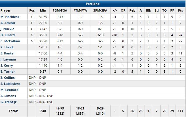 C.J. McCollum a terminé meilleur marqueur des Blazers avec 27 points (9/13), Damian Lillard a terminé à 24 points (8/18, 8 passes) et Maurice Harkless 20 points (9/13, 6 rebonds, 3 passes).