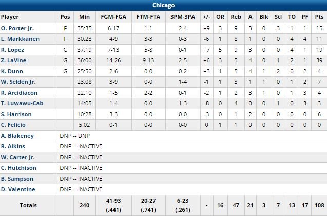 Encore menés 107-106 après 2 lancers réussis par Jimmy Butler à 4.8 secondes de la fin, les Bulls ont pris l’avantage sur le layup de LaVine (après remise en jeu de Robin Lopez – 19 points à 7/13, 9 rebonds, 3 passes – et débordement de Mike Scott) à 1.6 seconde. Il a manqué le lancer bonus mais bien défendu sur la dernière en jeu de Philadelphie. Après revue vidéo des arbitres et alors que les deux équipes avaient quitté le terrain pensant le match terminé, il a été ajouté 0.5 seconde au compteur, mais cela n’a pas suffi aux 76ers.