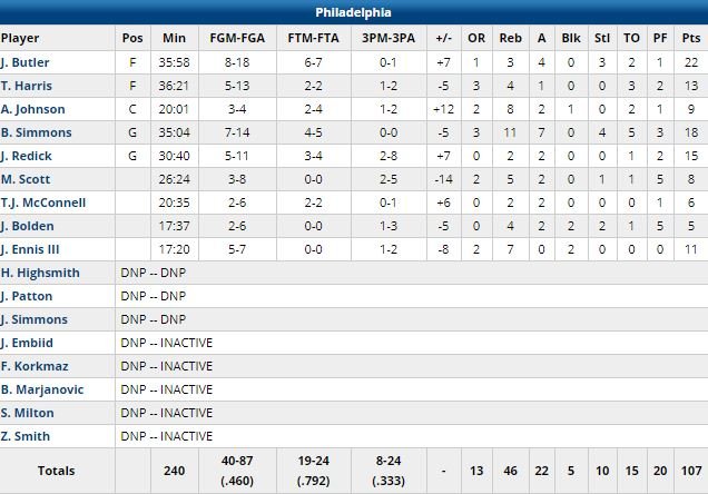 Butler a terminé à 22 points à 8/18 contre son ancienne équipe, Ben Simmons 18 points à 7/14, 11 rebonds et 7 passes. Joel Embiid (genou) a manqué son 7ème match consécutif. Les Bulls restaient sur 2 défaites avant ce match.