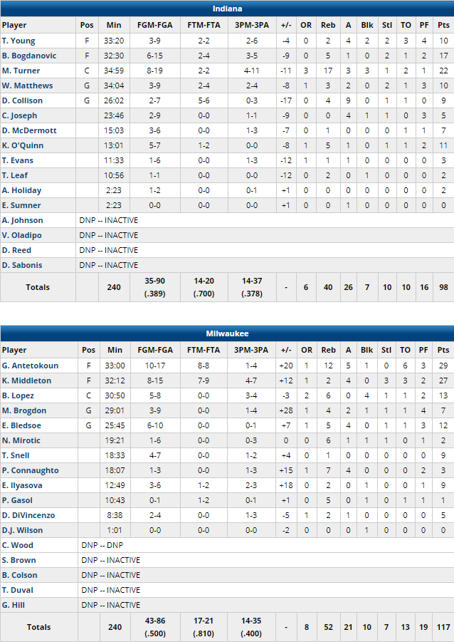 Comme souvent Giannis Antetokounmpo est l’homme du match avec un gros double-double : 29 points à 10/17, 12 rebonds, 5 passes, mais 6 ballons perdus en 33 minutes. Il a été aidé par un super Khris Middleton, auteur de 27 points à 8/15 dont 4/7 à 3-pts, 4 passes et 3 interceptions. Deux autres joueurs ajoutent au moins 10 points : 13 pour Brook Lopez et 12 pour Eric Bledsoe. L’équipe shoote à 50% dont un 14/35 à 3-pts, tout en limitant les Pacers à un petit 38.9%. Ces derniers ont été menés par les 22 points à 8/19, 17 rebonds et 3 contres de Myles Turner et les 17 points à 6/15 de Bojan Bogdanovic. Mais ils ont manqué de soutien à l’image du 6/25 des 3 autres titulaires en combiné.