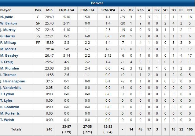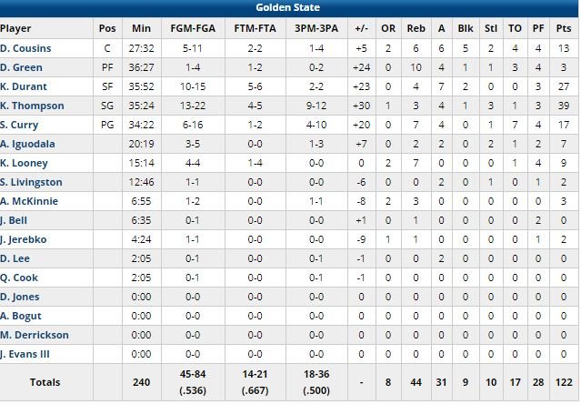 Devant 30-20 après 12 minutes, les champions ont connu une petite baisse de régime qui a permis à Denver de prendre sa seule avance du match (+1, 37-36 à 6’33 de la mi-temps puis 40-39 à 5’56) dans le 2ème quart mais cela n’a pas duré longtemps puisque les hommes de Steve Kerr sont rentrés au vestiaire avec une avance de 17 points, 67-50, grâce à un 17-2 pour finir la période ! La 2ème mi-temps a été plus disputée mais à aucun moment Denver n’a menacé l’avance de Golden State, qui a dominé le match 36-19 aux points inscrits sur contre-attaque, shooté à 53.6% contre 37.9% et à 18/36 de loin contre 12/33. L’équipe a terminé à 31 passes décisives, contre 17 pour les Nuggets, menés de jusqu’à 22 points.