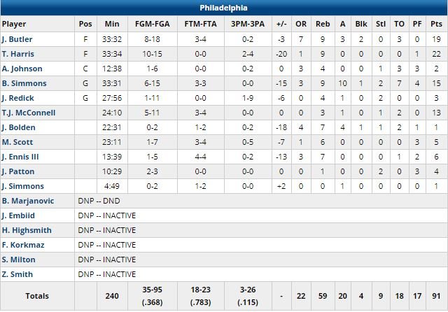 Tobias Harris a terminé meilleur marqueur des Sixers (2ème défaite d’affilée) avec 22 points, Ben Simmons a joué malgré une gastro et signé 15 points, 9 rebonds et 10 passes. L’équipe n’a réussi que 3 de ses 26 tentatives à 3-points (1/9 pour J.J. Redick). Philly (mené 59-44 à la pause) avait réussi à revenir à 12 points suite à un 9-6 mais a encaissé un 6-0 derrière en milieu de 3ème quart. Harden s’est légèrement blessé au poignet droit dans le 2ème quart mais est revenu en jeu (strappé).