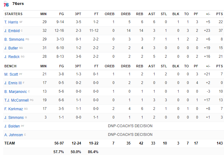 S’il a eu du mal à rentrer dans son match, Joel Embiid a fait un énorme chantier des deux côtés du terrain avec 33 points à 11/21, 12 rebonds et 2 interceptions en 28 minutes dont 24 points en seconde mi-temps, presque autant que les Pacers. Il a été bien aidé par les 16 points à 7/16 de Tobias Harris, les 15 points et 6 passes de Ben Simmons ou encore les 12 points de Jimmy Butler. Les Sixers shootent à un petit 43% dont 6/22 à 3-pts mais ils compensent avec leur défense en limitant les Pacers à 38.3%. Bien parti en première mi-temps, Bojan Bogdanovic a été éteint en seconde et termine avec 18 points à 6/16 alors que Darren Collison ajoute 14 points à 5/11. Les 3 autres titulaires combinent 20 points à 7/24.