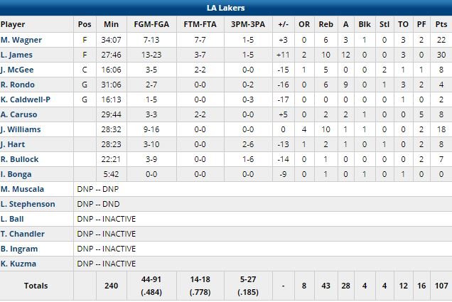 Sans trois de leurs titulaires habituels (Ball, Ingram et Kuzma), les Lakers (5ème défaite consécutive et 9ème en 11 rencontres) ont vu LeBron James signer son 80ème triple-double en carrière (30 points à 13/23, 10 rebonds, 12 passes) et son 7ème cette saison mais mis à part Moritz Wagner (22 points, 6 rebonds, 3 passes) et Johnathan Williams (18 points, 10 rebonds) aucun autre de ses coéquipiers n’a passé la barre des 10 points.