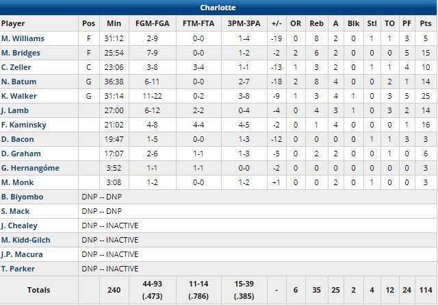 À 17/44 à 3-points, l’équipe a compté 6 joueurs à au moins 10 points dont Malcolm Brogdon et Nikola Mirotic (18 points chacun) et Donte DiVincenzo et Eric Bledsoe (11 points chacun). Kemba Walker a mené Charlotte avec 25 points. Les Hornets ont réussi la meilleure entame en prenant jusqu’à 14 points d’avance mais les Bucks étaient déjà revenus à 59-55 à la pause. Après avoir laissé leurs adversaires shooter à 51.1% tout en ne rentrant que 40.4% de leurs tentatives, les Bucks ont planté 39 points dans le 3ème quart (dont 18 pour le seul Lopez) et sont passés devant 94-87.