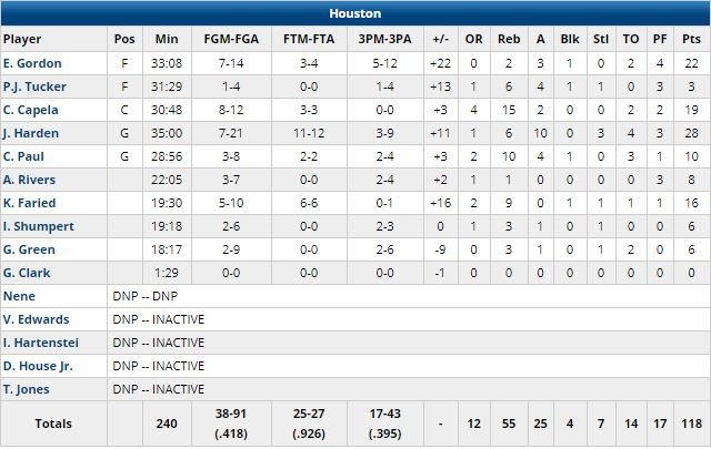 Les Hornets avaient marqué les 5 premiers points du match (hook shot de Willy Hernangomez et 3-points de Jeremy Lamb) avant d’encaisser un 8-0 et ne sont plus jamais passés devant. Houston menait de 19 points après 12 minutes et était devant 71-44 à la pause. Nicolas Batum (œil) et Tony Parker (repos) n’ont pas joué.