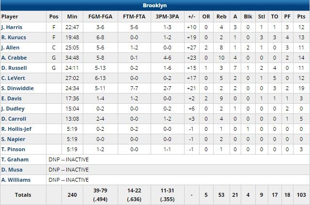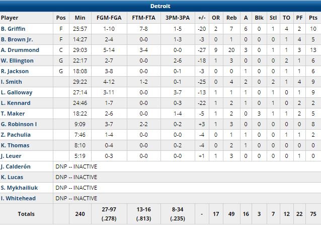 Andre Drummond a terminé à 13 points et 20 rebonds pour les Pistons, Blake Griffin 10 points à 1/10. L’équipe n’a shooté qu’à 27.8%, le plus petit pourcentage depuis le 27.1% de Memphis chez les Warriors le 11 novembre 2015. Menés 5-4, les Nets, devant 27-19 après un quart-temps et 61-35 à la pause, ont réussi un 14-4 et n’ont plus jamais lâché l’avantage. Au mieux, Detroit est revenu à 63-45 en marquant les 5 premiers points de la seconde mi-temps. L’écart est monté jusqu’à 31 points.