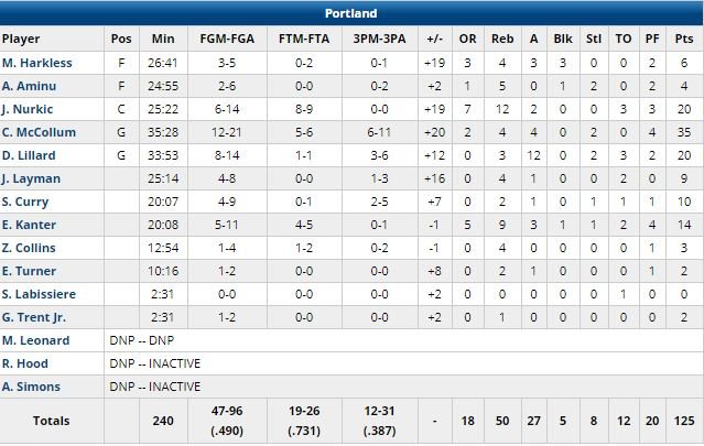 De passage à Los Angeles, C.J. McCollum (35 points à 12/21, 6/11 à 3-points, 4 rebonds, 4 passes), Jusuf Nurkic (20 points à 6/14, 12 rebonds, 2 passes) et Damian Lillard (20 points à 8/14, 12 passes) ont mis fin à la série de 5 victoires des Clippers avec un succès 125-104. Les Blazers ont pris le contrôle du match grâce à un 21-5 dans le 4ème quart-temps.