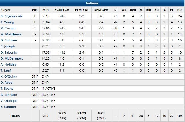 Avec 24 points à 9/16 de Bojan Bogdanovic, un Thaddeus Young qui s’est occupé du sale boulot à l’intérieur et un Darren Collison clutch (shoot à 5 mètres à 24.2 secondes pour le +6, 101-95), les Pacers s’en sont sortis tant bien que mal 103-98 contre les Knicks cette nuit. Indiana a failli perdre le ballon sur remise en jeu après un 3-points d’Emmanuel Mudiay (21 points, meilleur marqueur des siens devant Damyean Dotson et ses 18 unités) pour revenir à 3 points dans les dernières secondes. Au lieu de ça, Collison (16 points, 9 rebonds) a récupéré le ballon, provoqué la faute et réussi 2 lancers pour mettre fin à la série de 2 défaites de son équipe.